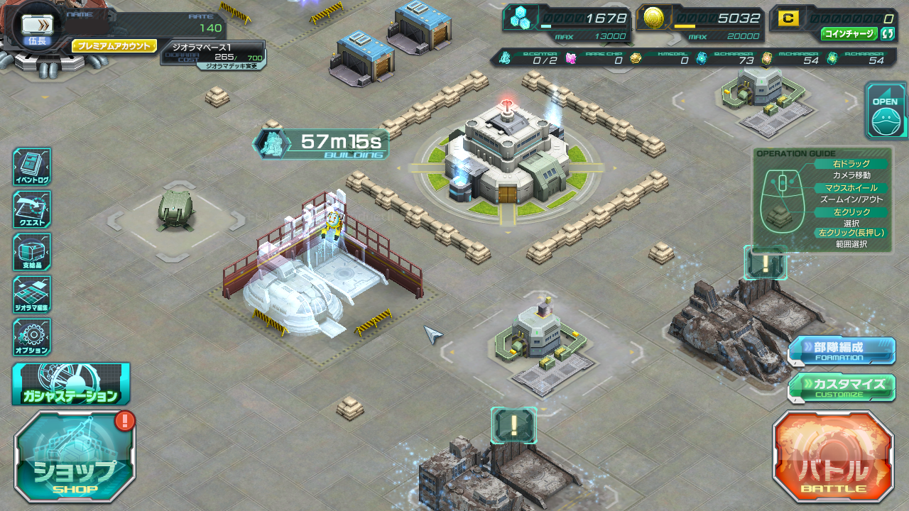 ジオラマベースには、資源や資金の生産施設やユニットの開発施設を建造し、資源や資金を貯めて、歴代ガンダムシリーズのMSやMAを開発していくのだ。