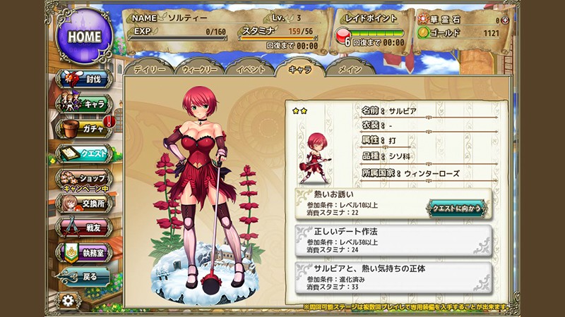 「花騎士」たちの情報は様々なタブから閲覧できる。キャラクターは「レアリティ」「属性」「品種」などのステータスとレベル概念を持っており、戦闘に参加させることで成長する。また、各キャラクターをフィーチャーした専用のクエストが用意されているので、レベルを上げたら忘れずにクエストをこなしておこう!