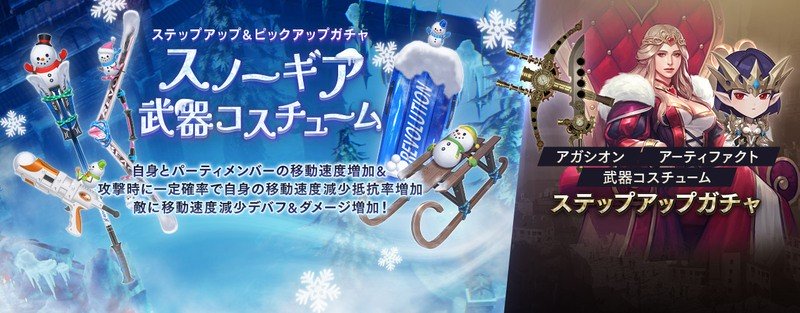 スキー衣装に身を包んだ白く可愛い「アガシオンスキーベアー」や、雪の風景が似合う騎乗ペット「アイスドラゴン」が出現するほか、新たに登場する武器コスチューム「スノーギア」は、自分とパーティメンバーの移動速度を増加し、さらに攻撃時に一定確率で凍結路面を直線的に発生させ、その上にいる敵に対して移動速度減少とダメージ増加のデバフを付与する。是非この機に手に入れよう。