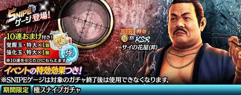 また、極スナイプガチャではイベント特効効果付きの新KSRキャラクター「サイの花屋(昇)」が登場。ガチャを引くことでスナイプゲージが貯まり、100%まで貯めたスナイプゲージを消費すると確定で目当てのKSRキャラクターを入手可能。