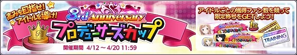 さらに、各アイドルごとの獲得ファン数をランキング形式で競う、「3rd Anniversary プロデューサーズカップ」も開催中。ランキング上位の報酬として、イベント限定称号やトレーニングチケットがもらえるので、上位入賞を目指して挑戦しよう。
