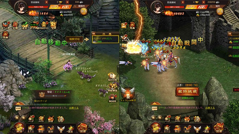 ▲キャラクターの移動は「手動」と「自動」に適宜切り替えが可能。手動の場合は任意の場所をクリックすることでキャラクターが追随して移動し、クエスト目標がある場合には自動で移動させることもできる。これは戦闘に関しても同様で、自動に設定すればオートバトルでサクサクと進行するため非常に楽だ。