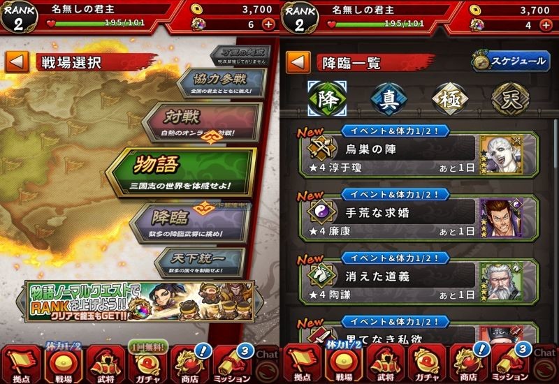 「三国大戦スマッシュ!」の基本のシステムはとてもシンプルで、物語を進めてランクアップさせ、武将を集めつつプレイ可能なコンテンツを開放していくことがメインとなっている。