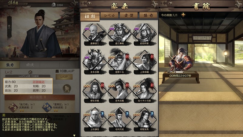 家来の資質の高めるためには、資質経験値を貯めるほかに、「強化の奉書」という一気にレベルアップさせられるアイテムも用意されている。ちまちまと時間をかけて家来を育てられない人には大変便利なアイテムだ。状況に合わせてうまく利用したい。