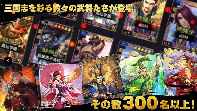 ガチャ要素でも入手できる本作の武将は魅力的かつ人物の特徴を捉えた秀逸なイラストで再現。三国志好きな人なら思わず有名武将を真っ先にコレクションしたくなるだろうが、本作の場合単純に高レアリティの武将だけを揃えても勝つことができないという絶妙なバランス調整が施されている。