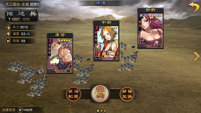 同じ名前の武将を複数所有している場合「進化」システムを利用して武将を強化することが可能で、1度進化するたびに10ポイントの能力値を再配分できる仕組みになっている。つまりダブった武将を無駄にすることなく、その人物をパワーアップさせることができるのだ。