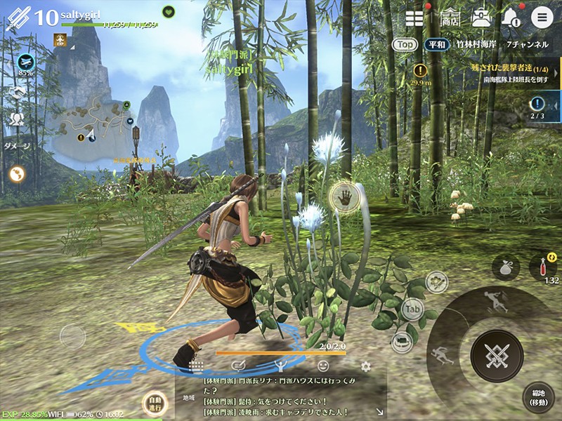進行中のクエストおよびサブクエストは画面右上に表示。タップすることで自動的に移動してくれるオートシステムを採用しているため操作性は快適だ。プレイ中に会得できるファストトラベルシステム「縮地」を利用すれば目的地へ素早くテレポートでき、サクサクとプレイを進行できる。簡単操作で遊べる点も大きな魅力だ。