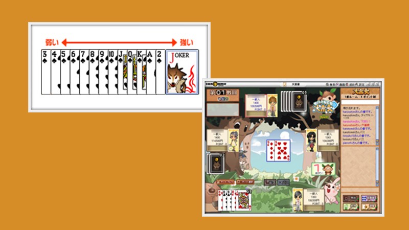カードを出す順番のプレイヤーは、先に出したプレイヤーよりも「強いカード」を出すのが決まりで、親が複数枚のカードを出した場合は次のプレイヤーも複数枚出さなくてはならない。