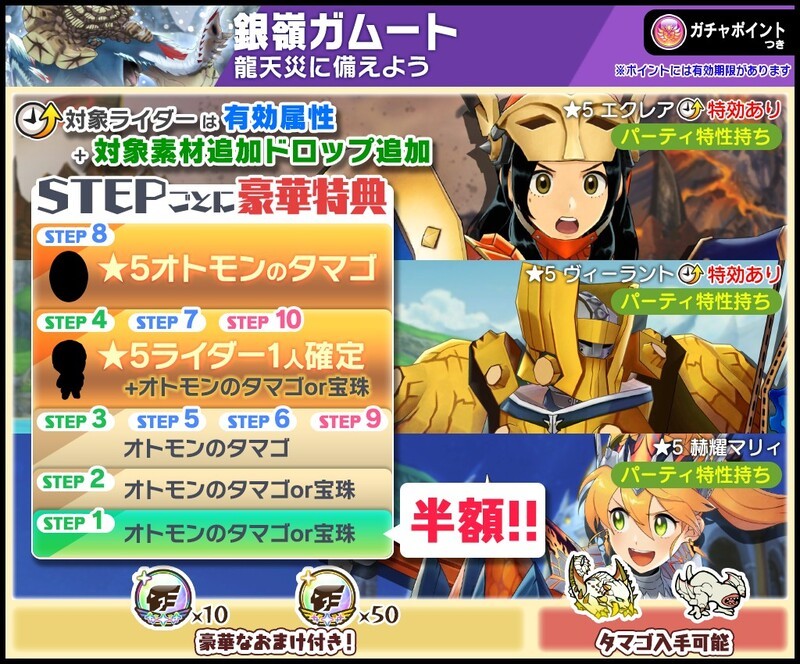 「龍天災 対銀嶺」(中級~超級)の初回クリア報酬で★5「銀嶺ガムートのタマゴ」などを、超級~極級・伍のクエストミッションクリア時には、限界突破に必要なレア素材「銀嶺玉」を獲得可能。