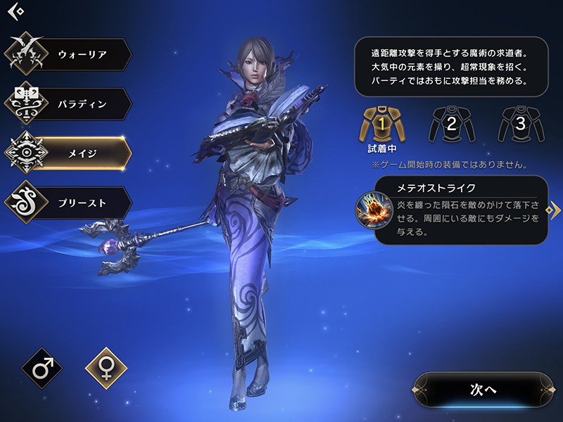 ゲームをスタートすると、最初に自分の分身として冒険を繰り広げることになる主人公キャラクターを設定することになる。本作に登場する初期クラスは「ウォーリア」「パラディン」「メイジ」「プリースト」の4種類で、それぞれ男女の性別を選択可能。自分のバトルスタイルに合ったクラスを選んでみよう。