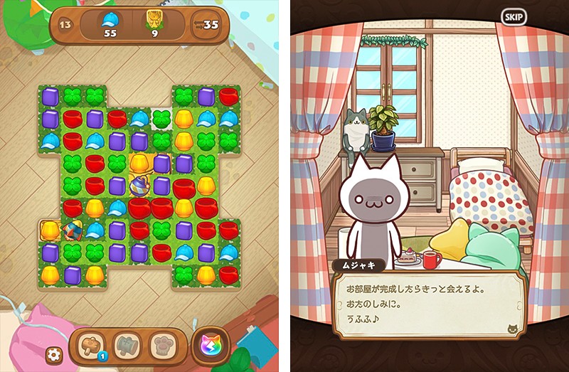 現在正式配信中の『マジンマンション』は、スマホアプリの定番「3マッチパズル」形式のゲームをプレイしながらボロボロのマンションをリフォームしていくおすすめ新作スマホゲーム。可愛いねこのようなキャラクター「ムジャキ」と一緒に部屋をキレイにしていくプレイが楽しいファンシーなアプリだ。
