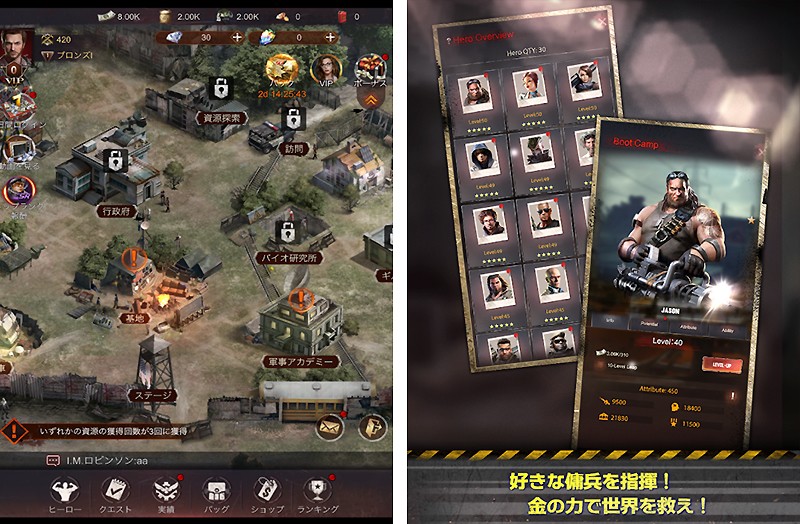ゲーム進行の要となるヒーローキャラクターはガチャ要素で入手可能。資源を求める探索系コンテンツで発生するバトルでゾンビ軍団と戦うために必要になるヒーローたちは、強化と育成要素を活用してパワーアップを施すこともできるので、多彩なヒーローキャラクターを傭兵に迎え入れて自慢の軍隊を作り上げていこう。