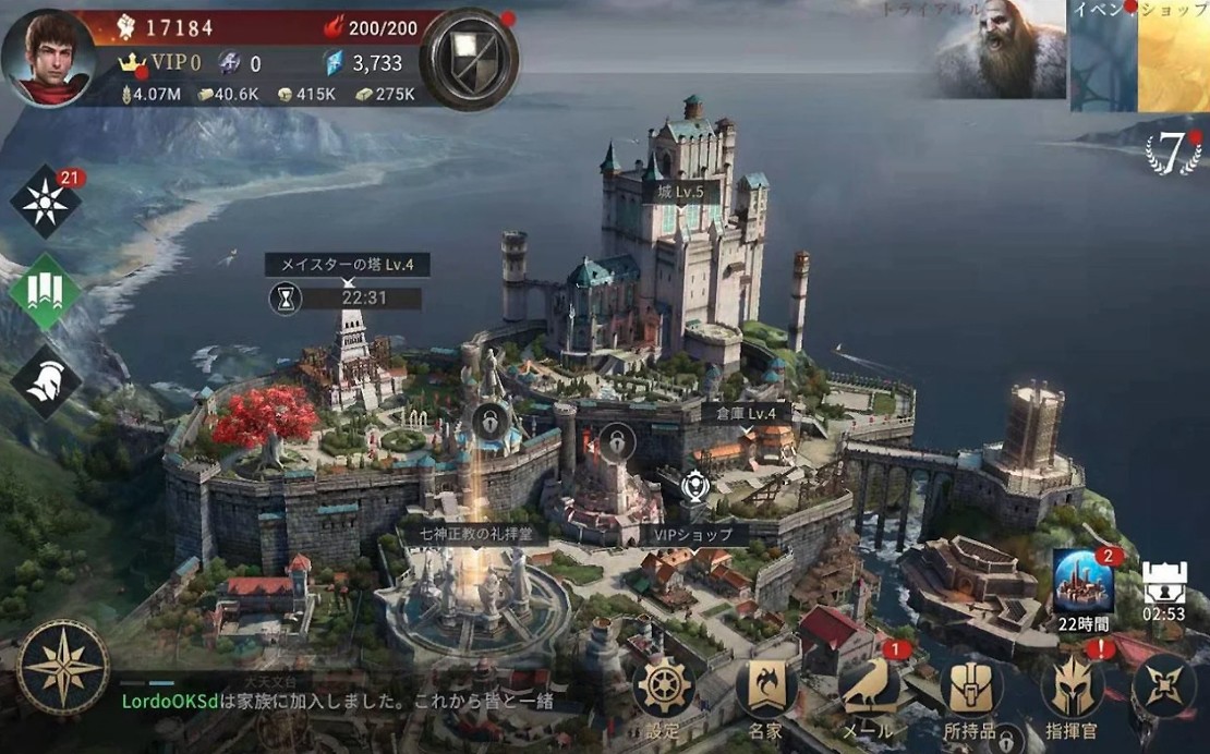 領地内部を上空からの俯瞰で見下ろすプレイ画面はファンタジー世界の雄大さに溢れ、プレイヤーの好奇心を大いに刺激する。全ての元となる「主城」のレベルを上昇させながら各種施設をグレードアップしていくことが序盤の流れになり、レベルが上昇すると新たなコンテンツがアンロックされる。焦らず着実に歩を進めよう。