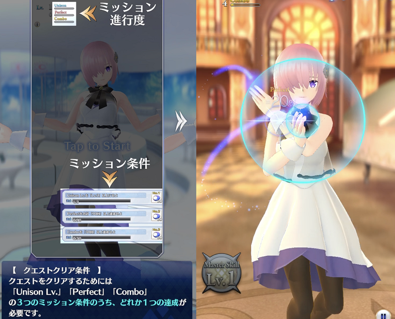 コンボをしっかりつなげていけばユニゾンレベルが上昇し、さらにスコアを稼ぎやすくなる。大量のコンボを一気に稼げる切り札マスタースキル、フリック入力でさまざまな効果が発動するトリックスキルなどを駆使してノルマを達成し、マシュとのダンスを成功させよう!