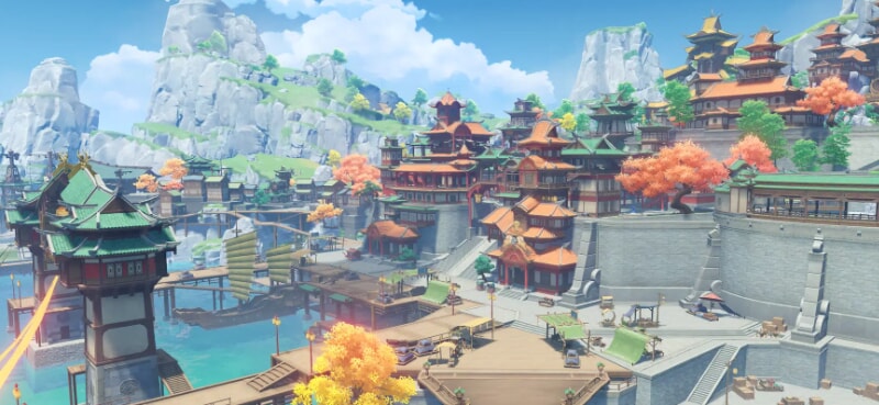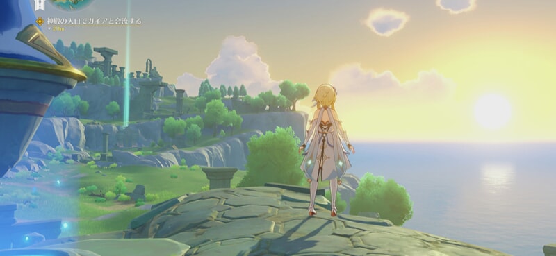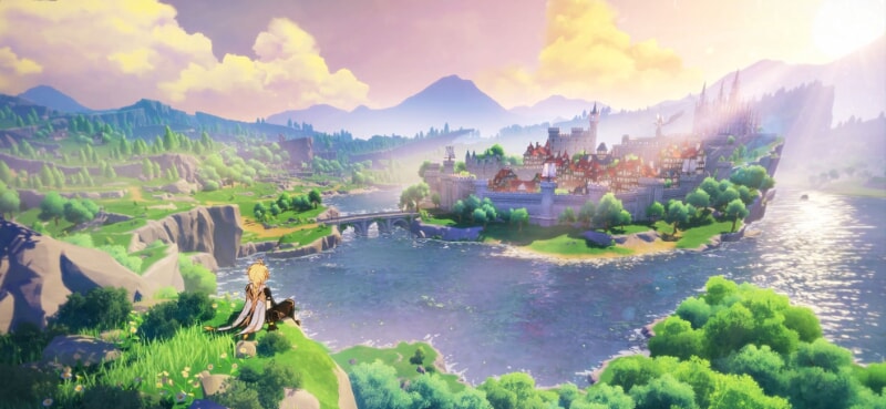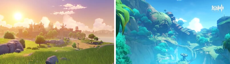 初めてテイワットの大地に降り立ったとき、まず圧倒されるのはその息をのむような美しさである。青く澄んだ空の下に広がる緑豊かな草原、遠くにそびえる万年雪を抱いた山々、夕日に染まる港町の灯り、雨上がりに架かる虹、アニメ調のグラフィックでありながら、光と影の表現、水面に映り込む景色の反射、風にたなびく草木のひとつひとつが驚くほど丁寧に描き込まれている。