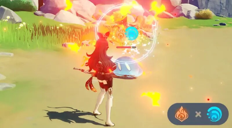 『原神』の戦闘を語るうえで欠かせないのが、7つの元素を組み合わせて発動する「元素反応」というシステムである。例えば、水元素の攻撃で敵を「濡れた」状態にしてから氷元素で追撃すれば「凍結」が発生し、敵はその場で完全に動けなくなる。炎元素で燃えている敵に風元素をぶつければ「拡散」が起きて周囲の敵にも炎が広がっていくなど、こうした組み合わせの総数は非常に多く、パーティーの編成によって生まれるコンボのバリエーションはほぼ無限といっていい。
