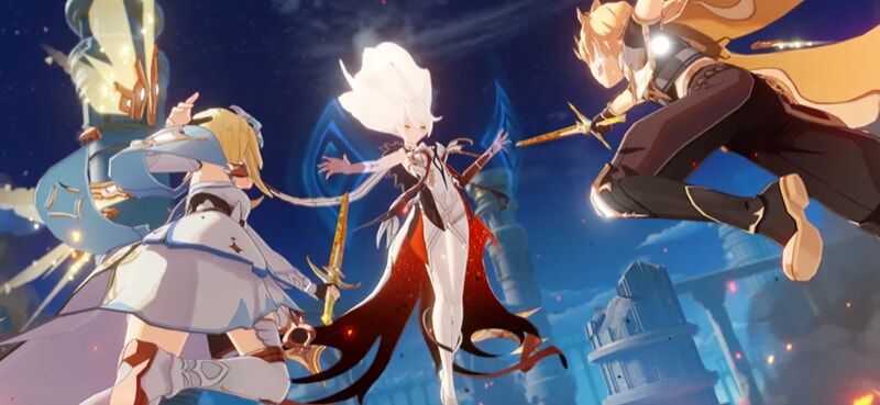 風・炎・雷・水・氷・草・岩の7つの元素が交錯する幻想世界「テイワット」が舞台であり、プレイヤーは異世界からやってきた「旅人」として謎の神に引き離された双子の片割れを探す冒険へと旅立つ。個性豊かな仲間と最大4人パーティーを組み、テイワットの各国を統治する「七神」にまつわる壮大な物語を追いかけていく。