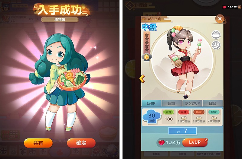 料理娘たちは「苦味」「辛味」「塩味」「旨味」の4種類に分かれる料理特性に違いがあり、報酬アイテムを利用する強化・育成システムでレベルアップと能力強化を行うことが可能。レベルや段位が上昇すると様々なコンテンツで活躍できるようになるので、手に入れた料理娘はしっかりと育成していこう。