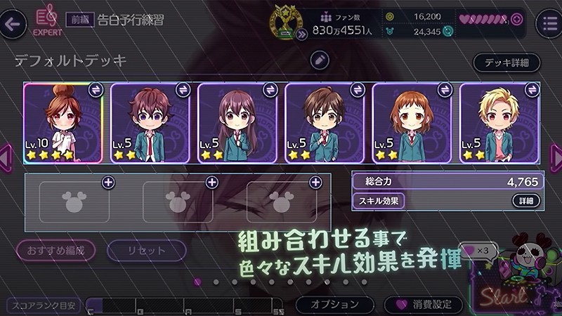 リズムゲームパートには、手に入れたキャラクターを編成するデッキで挑む。各キャラクターはそれぞれ独自のスキル技を持っており、編成を変えていくことでスキル効果が発生してリズムゲームプレイが捗る仕組みだ。キャラクターコレクション要素と育成、そしてリズムゲームパートが組み合わさったシステムが魅力だぞ。