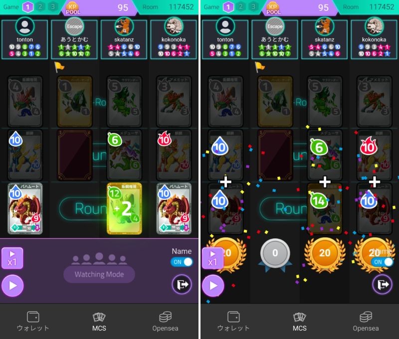 バトルはカミポイントを賭けて、数字の大きさで競い合う。