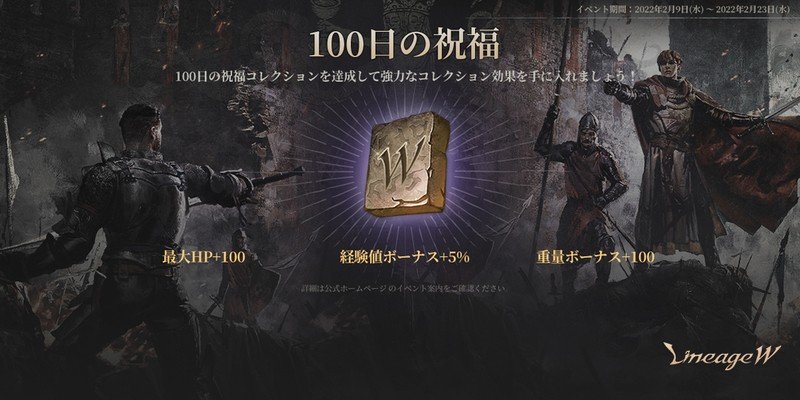 そのほか、イベント「100 日の祝福」では、ショップメニューより100アデナ(ゲーム内通貨)で「Wの証」を購入し、コレクションに登録すると、期間制のコレクション効果として「経験値ボーナス +5%」や「最大HP+100」「重量ボーナス+100」が獲得できる。キャラの育成などや戦闘に役立つ効果なので、忘れず取得しておこう。