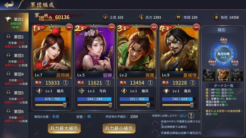 武将が率いる兵は盾兵、槍兵、騎兵、弓兵の4種類。武将ごとに率いる兵種が異なるのが特徴だ。率いる兵を意識して武将を組み合わせることが出来れば、陣形ボーナスが発動し、軍の攻撃力や防御力、体力の増加、進軍速度や士気の上昇、籠城ボーナスなど様々なパワーアップ恩恵が受けられる。