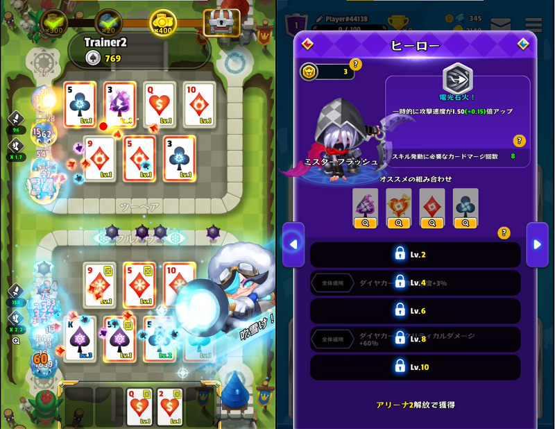 たとえば、場に出したトランプを組みあわせてワンペアを作ると攻撃速度が1.6倍、フルハウスなら2.2倍アップする仕組みだ。最強の役であるロイヤルストレートフラッシュが完成すれば、攻撃スピードは3倍にもなるぞ。