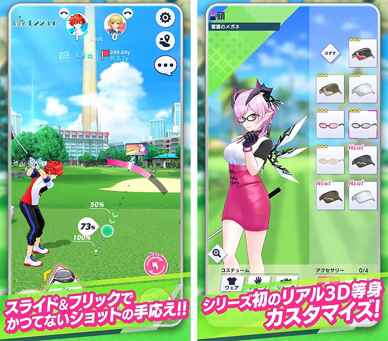 アプリをやり込んで腕を磨きながら世界の強豪たちと対戦したり、アプリを通じてできた友達と一緒に会話しながらのんびりプレイしたりと、ゲームには様々なレベルの楽しみ方があるため、幅広い年代層のユーザーがゴルフの世界を満喫できる。シリーズ初となる3D等身キャラのカスタマイズ要素もあるぞ。