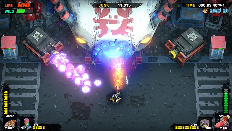 ツインスティックシューターバトルの大きな魅力は、自分の周囲360度全てに気を配りながら戦う「全方位型バトル」システムで、本作では敵の容赦ない弾幕が発生するので、キャラを動かしながら敵弾を避けつつ、4種類に分かれる武器で攻撃を叩き込むアクションバトル要素を大いに堪能できる。