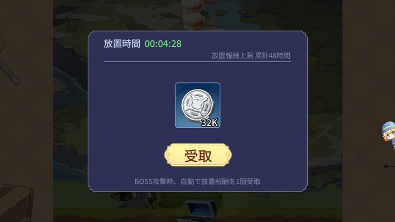 ゲームから離れている時間に応じて報酬を獲得できる放置システムも便利。