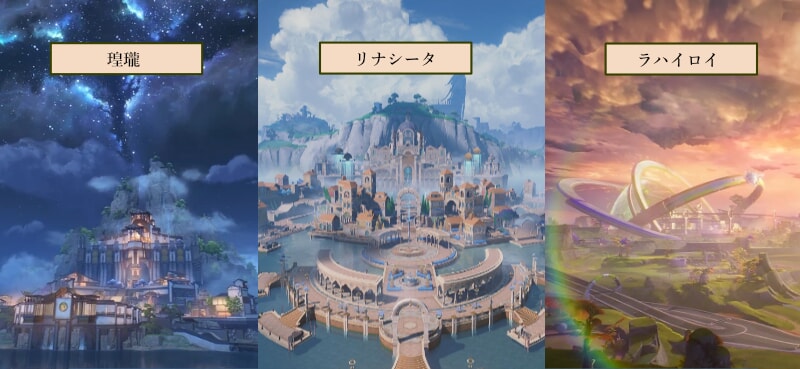 現在実装されている3つのエリアは、それぞれまったく異なる雰囲気を持っている。最初に訪れる「瑝瓏」は東洋風の風景が広がる地域で、龍の姿をした歳主「角」が治めている。壮大な山岳地帯や古代遺跡が点在し、荒廃と復興が入り混じる独特の空気感がある。続いてVer2.0で追加された「リナシータ」は、ヨーロッパの港町を思わせる芸術と仮面の国で、都市国家ラグーナを中心にカルネヴァーレ(仮面舞踏会)の文化が色濃く描かれている。さらにVer3.0では学園都市「ラハイロイ」が登場し、スタートーチ学園を舞台にした青春群像劇が展開される。
