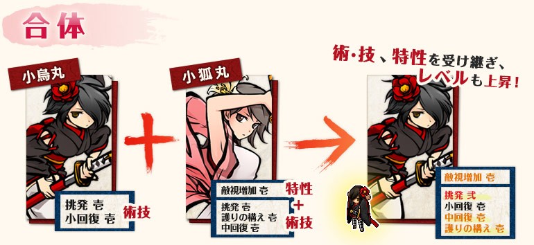 ベースとなる式姫に素材となる式姫を合体させると、素材となった式姫のスキルを引き継ぎ、同じスキルの場合、一定確率でスキルがレベルアップ!経験値や熟練度も引き継ぐことができるぞ!レベルアップするまであきらめずにコツコツ頑張ろう!