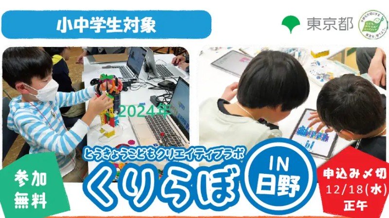 令和7年1月12日、日野市中央公民館にて、小中学生を対象としたデジタルクリエイティブ体験イベント「くりらぼin日野」が開催されます。参加者は、ゲームプログラミングや音楽制作を通じて、楽しみながらデジタルスキルを磨けます。デジタル社会を担う次世代のクリエイターたちに、幅広いデジタル体験の機会を提供することが目的です。都内在住・在学の小中学生なら誰でも参加可能。12月2日正午から18日正午まで、公式ホームページで申し込みを受付中です。未来のクリエイターを目指す皆さん、ぜひこの機会にデジタルの世界へ飛び込んでみませんか?