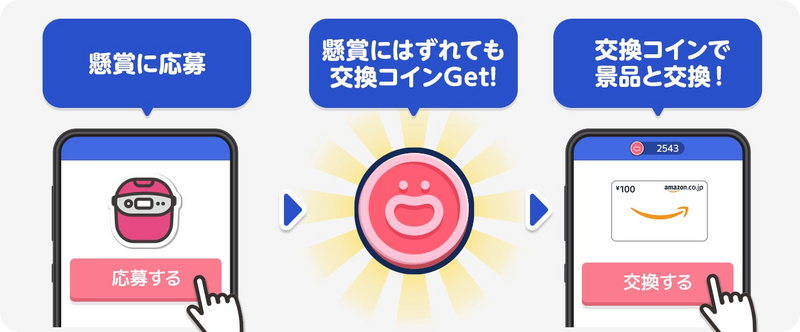 獲得した応募ポイントで様々な懸賞品に応募可能。さらに、ハズレた場合でも応募ポイントが「交換コイン」として還元され、別の景品と交換できる仕組みを導入しています。