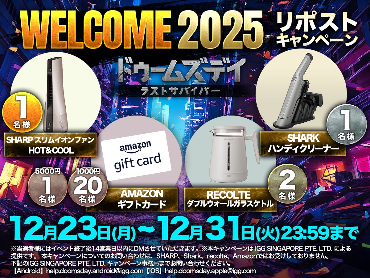 ドゥームズデイ:ラストサバイバー Welcome 2025リポストキャンペーンに参加しよう!SHARPスリムイオンファン HOT&COOL、Sharkハンディクリーナー、recolteダブルウォールガラスケトル、Amazonギフトカードなど豪華賞品が当たります!