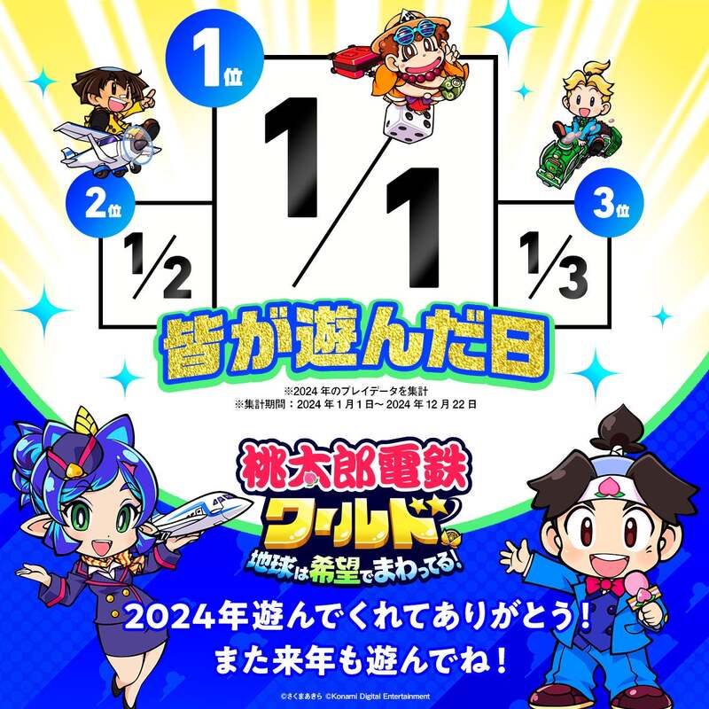 株式会社コナミデジタルエンタテインメントは、発売中のNintendo Switch™用ソフト『桃太郎電鉄ワールド ~地球は希望でまわってる!~』(以下、『桃鉄ワールド』)の累計出荷本数(ダウンロードを含む)が、150万本※1を突破したことをお知らせします。また、「桃太郎電鉄」公式Xでは、『桃鉄ワールド』のプレーデータをまとめた「2024年 今年の振り返り」を公開しました。