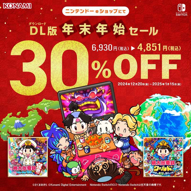 ニンテンドーeショップ(My Nintendo Store)では、1月15日(水)まで、『桃太郎電鉄ワールド ~地球は希望でまわってる!~』と『桃太郎電鉄 ~昭和 平成 令和も定番!~』のダウンロード版がそれぞれ30%オフの4,851円(税込)で購入可能です!年末年始にぴったりな「桃鉄」シリーズを、ぜひこの機会にお楽しみください!