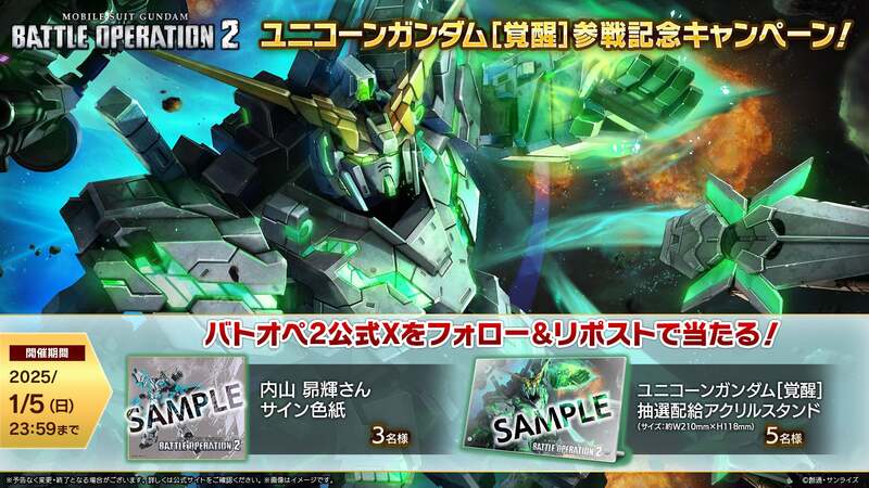 専用ゲーム『機動戦士ガンダム バトルオペレーション2』 (以下、『 バトオペ2』 )にて『ハッピーニューイヤー2025』の開催と、新機体「ユニコーンガンダム[覚醒]」の実装が決定したことをお知らせ