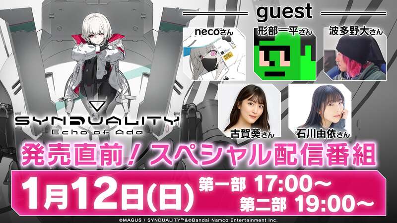 また1月12日(日)に配信番組の実施が決定しました。ゲストにはコフィンデザインの形部一平さん、キャラクターデザインのnecoさん、シナリオ担当の波多野大さん、エイダ役の石川由依さん、ノワール・ミステル役の古賀葵さんをお呼びして、SYNDUALITY Echo of Adaの最新情報をお届けします。