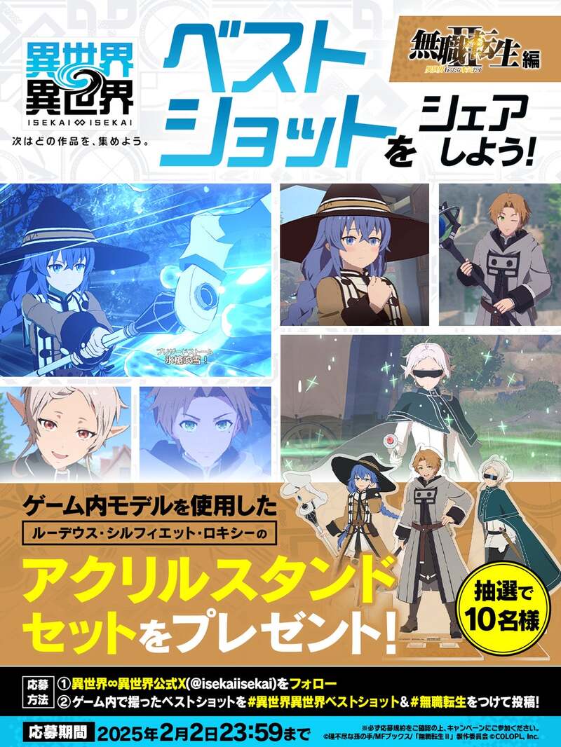『異世界∞異世界』の公式Xをフォローして、『異世界∞異世界』内で撮影したベストショットを特定のハッシュタグ(#異世界異世界ベストショットと#無職転生の2つ)をつけて投稿しましょう!抽選で10名様に『異世界∞異世界』内のモデルを使用したアクリルスタンドセットをプレゼントいたします。