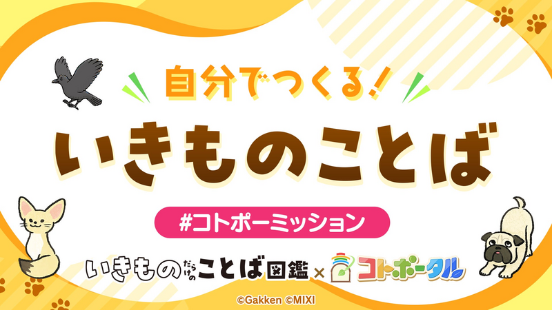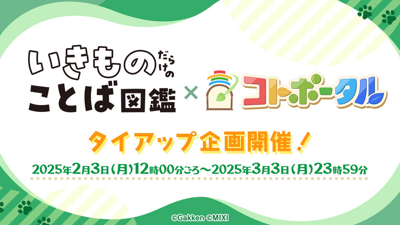 ことばの魅力を発信する『いきものだらけのことば図鑑』と、ことばづくりをより楽しむ、ことばを考えて日常を楽しくすることを目指すコミュニティ『コトポータル』がタッグを組み、子どもから大人までいっしょになって「ことばを学び・楽しみ・遊ぶ」ユーザー参加型のタイアップ企画を2025年2月3日(月)12時00分ごろ〜2025年3月3日(月)23時59分の間で実施いたします。