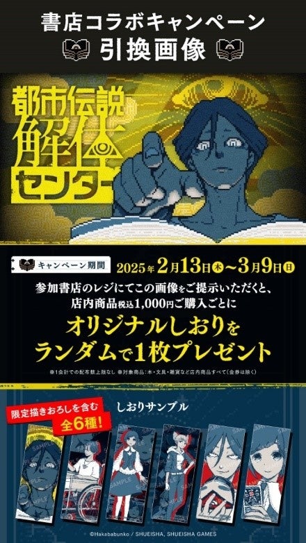 期間中、対象書店で商品のご購入時に、所定の引換画像をご提示もしくはレジにてお声掛けいただいた方へ、購入金額1,000円(税込)につき1枚の「都市伝説解体センター」オリジナルしおりをランダムで配布します。オリジナルしおりは全6種で、うち2種は「都市伝説解体センター」開発チームの墓場文庫による描き下ろしイラストのデザインです。