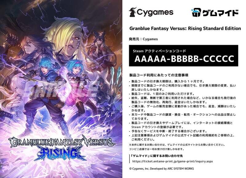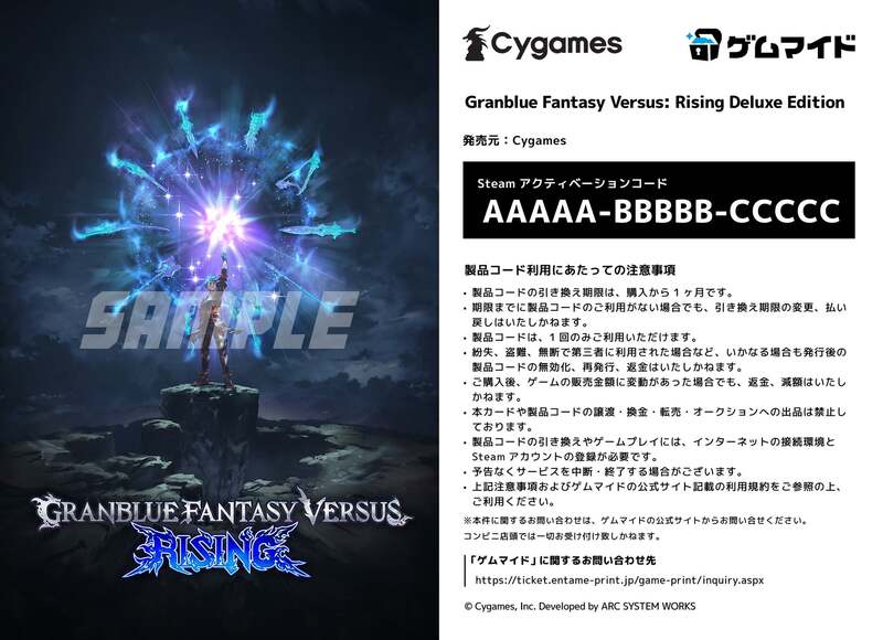 株式会社イード(本社:東京都中野区、代表取締役:宮川 洋)は、PCゲームの配信プラットフォーム「Steam」のアクティベーションコード「Steamキー」付きのブロマイドを販売する「ゲムマイド」にて、株式会社Cygamesの『Granblue Fantasy Versus: Rising Standard Edition』、『Granblue Fantasy Versus: Rising Deluxe Edition』を2月14日(金)より販売開始いたします。