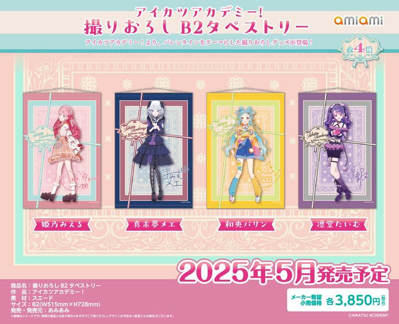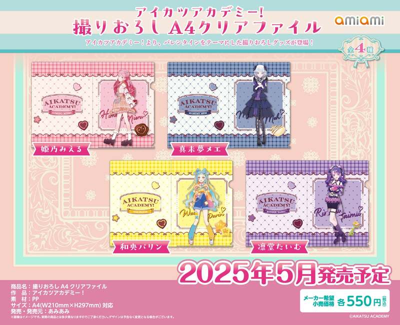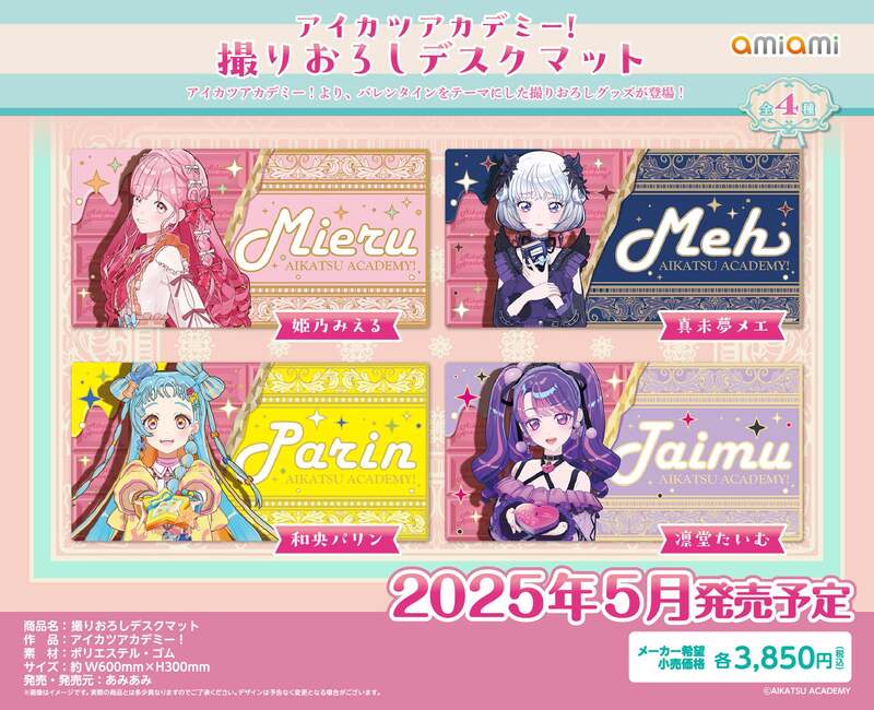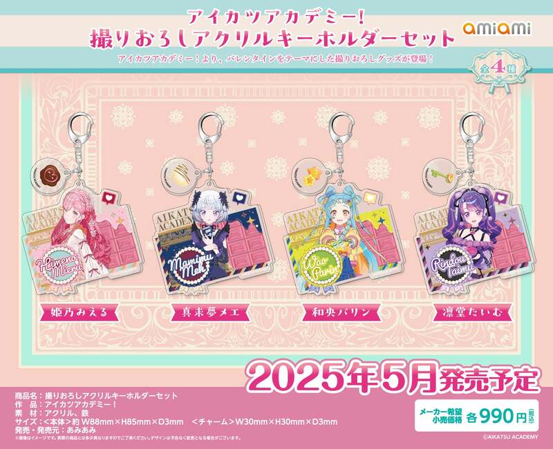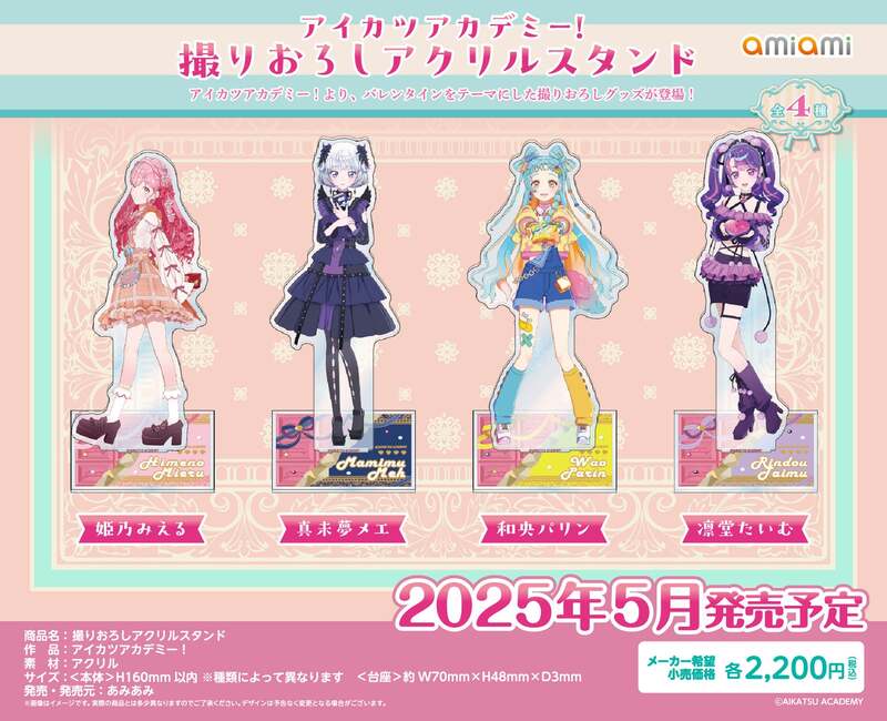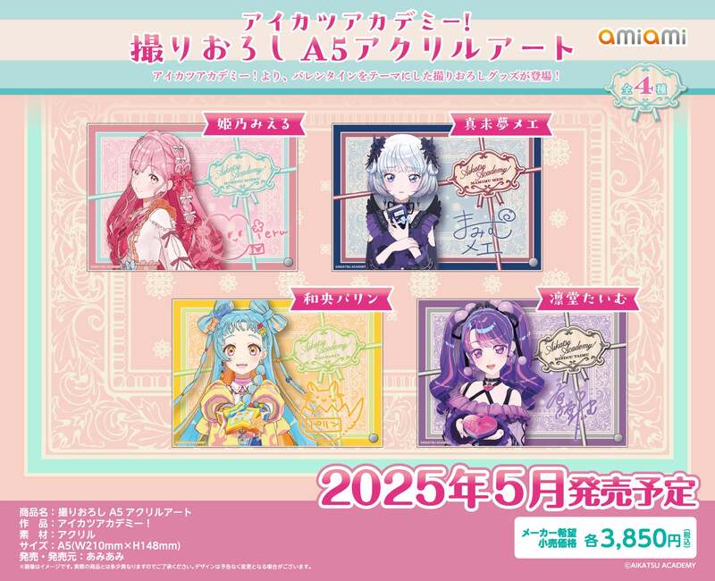 フィギュア&ホビー通販大手の「あみあみ」を運営する、大網株式会社(本社・東京都文京区)は、『アイカツアカデミー!』の【「バレンタイン」をテーマにした撮りおろしグッズ】全7商品を、2025年5月予定で発売いたします。