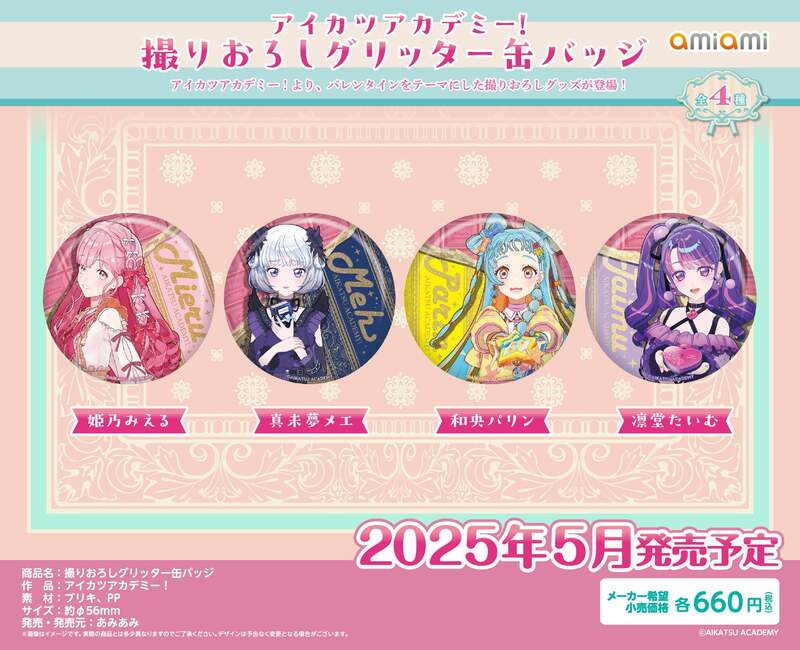 2025年5月、あみあみから『アイカツアカデミー!』のバレンタイン撮りおろしグッズが登場します。アクリルスタンド、キーホルダー、缶バッジなど、全7種類のアイテムがラインナップ。姫乃みえるや真未夢メエなど、人気キャラクターたちのかわいい姿を楽しめます。グッズはあみあみオンラインショップや実店舗で購入可能。アイカツファンの皆さん、お気に入りのアイテムをゲットして、推しキャラとの特別な時間を過ごしましょう!