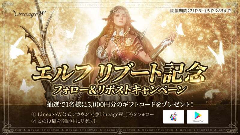 リネージュWの「エルフ リブート」を記念して、参加条件を満たした方の中から、抽選でギフトコード5,000円分を1名様にプレゼントします。