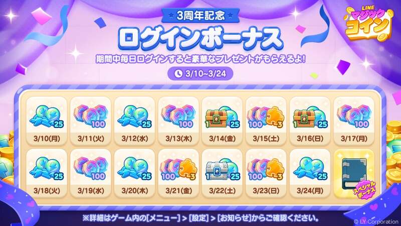 LINEヤフー株式会社では、当社が展開するカジュアルコインゲーム「LINE マジックコイン」が、2025年2月28日(金)で3周年を迎え、この節目をお祝いした、特別な報酬がもらえる豪華イベントや、QUOカードPay1,000円分が当たる公式Xキャンペーン豪華を開催します。