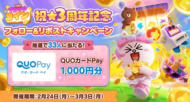 期間中に「LINE マジックコイン」の公式X(旧Twitter)をフォローし、該当の3周年お祝い投稿をリポストすると、33名様に抽選でQUOカードPay 1000円分が当たるフォロー&リポストキャンペーンを開催します。