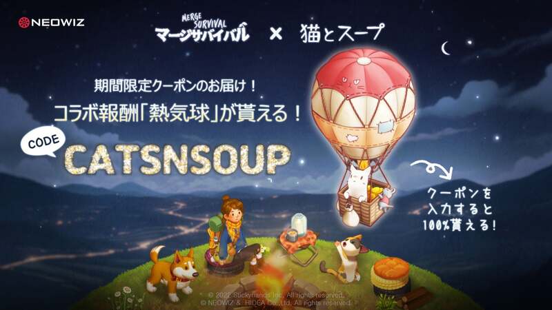 株式会社NEOWIZ (本社:韓国 京畿道城南市、共同代表:金 承徹(キム・スンチョル)/裵 泰根(ベ・テグン))は子会社となる株式会社StickyHands Inc.(代表:キム·ミンウ)が開発を手掛けたカジュアルパズルゲーム『マージサバイバル(Merge Survival)』におきまして、放置型癒し系ゲーム『猫とスープ』とのコラボアップデートを実施いたしました。