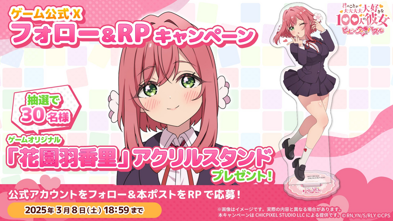 『100パズ』のリリース決定を記念して、公式Xにてプレゼントキャンペーンを開催しています。フォロー&リポストで、花園羽香里(CV. 本渡 楓)のアクリルスタンドが抽選で30名様に当たるチャンス!